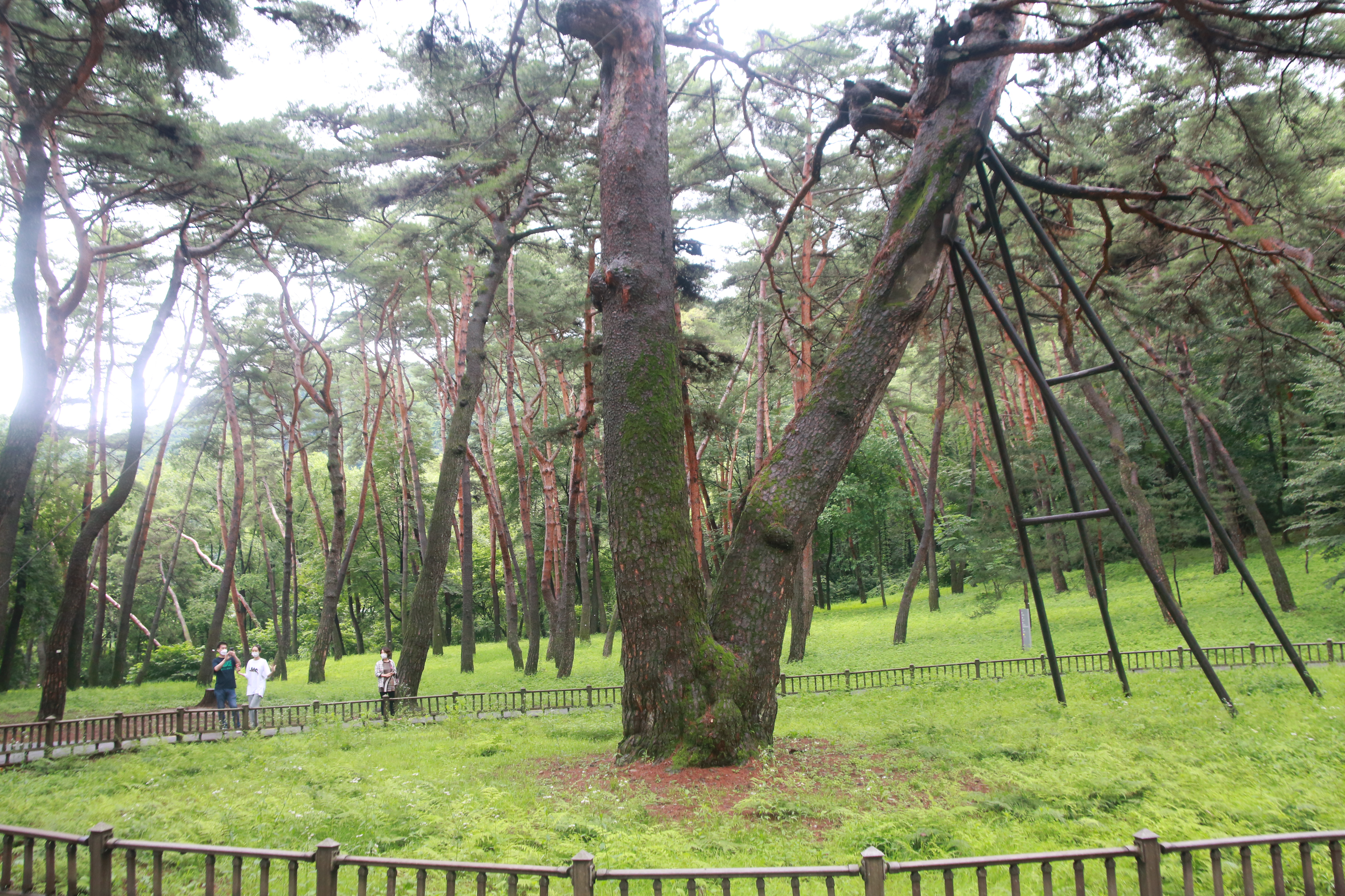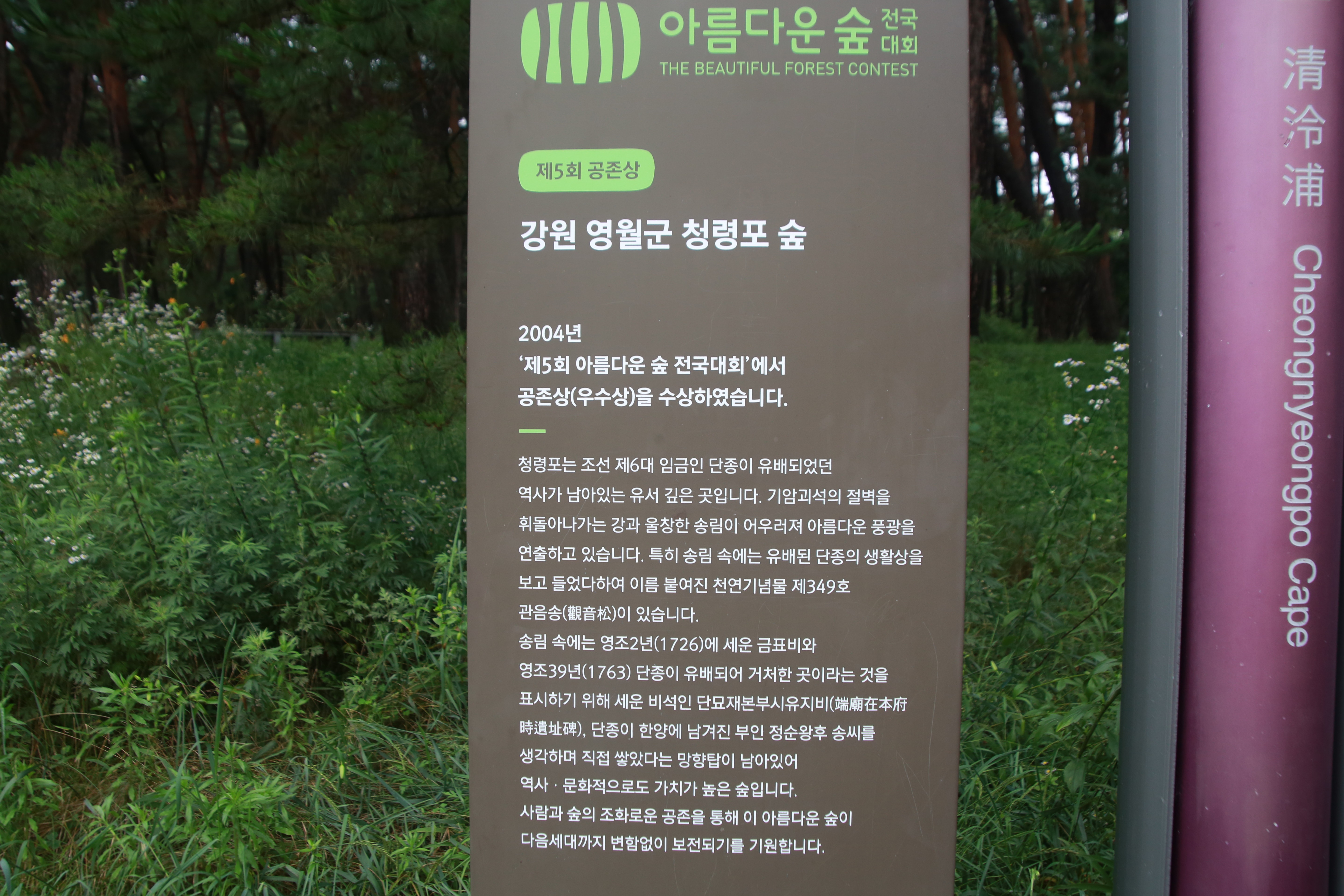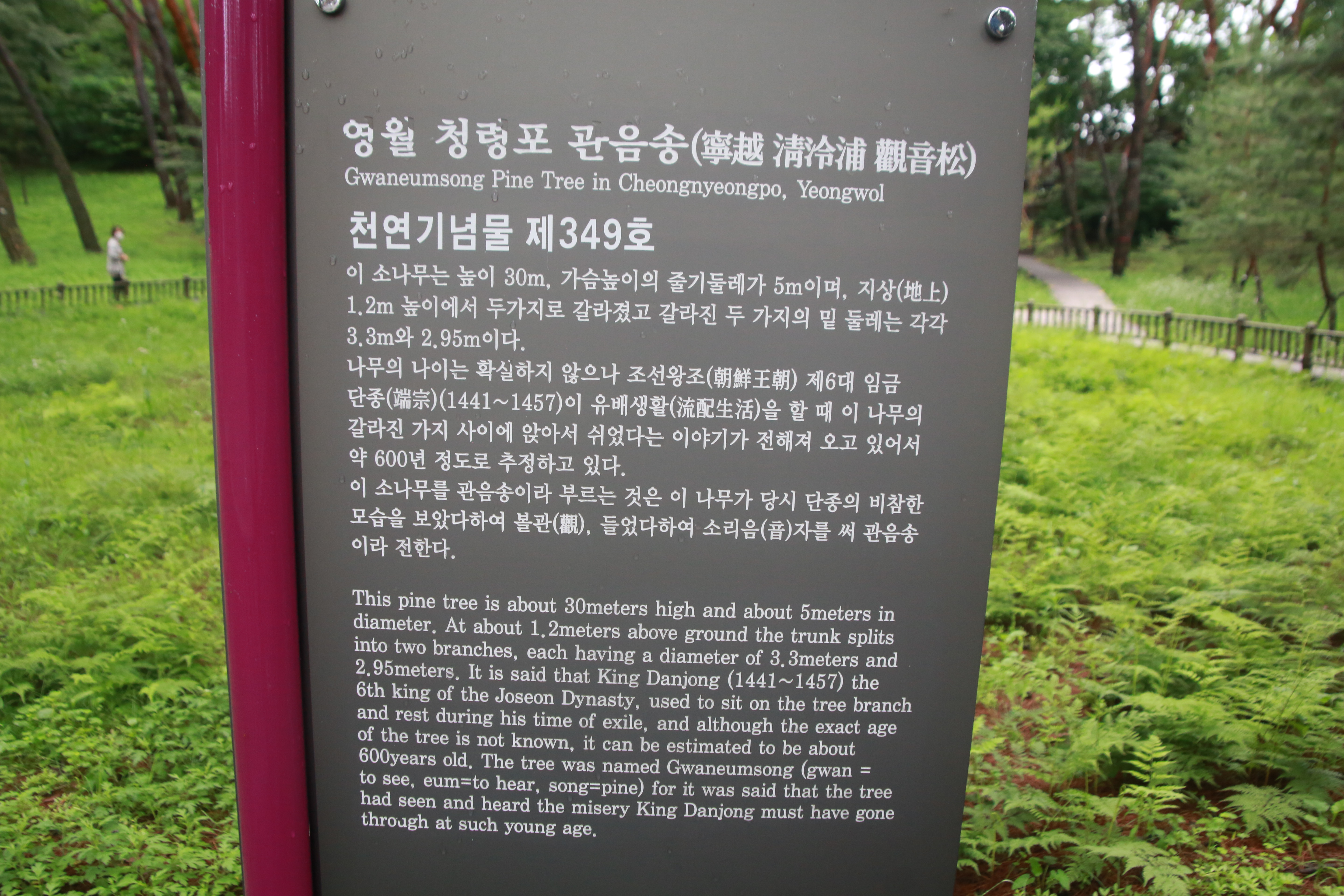 우리 가족은 청령포 주차장에 주차하고 입장표를 사고 선착장으로 갔다. 관광객은 많지 않아 정원 48석이지만 20여명이 탔다. 배는 5분도 채 안되어 강을 건너 강나루에 도착했다. 청령포에는 단종어소, 단묘재본부시유지비, 금표비, 노비가 거주했던 초가집 행랑채, 노산대, 망향탑이 있고, 단종이 유배생활 할 때 두 갈래로 갈라진 이 소나무에 걸터 앉았 쉬었다는 관음송(觀音松)이 있었다. 단종이 유배했을 당시 이 소나무의 나이는 60년으로 추정하고 있다.