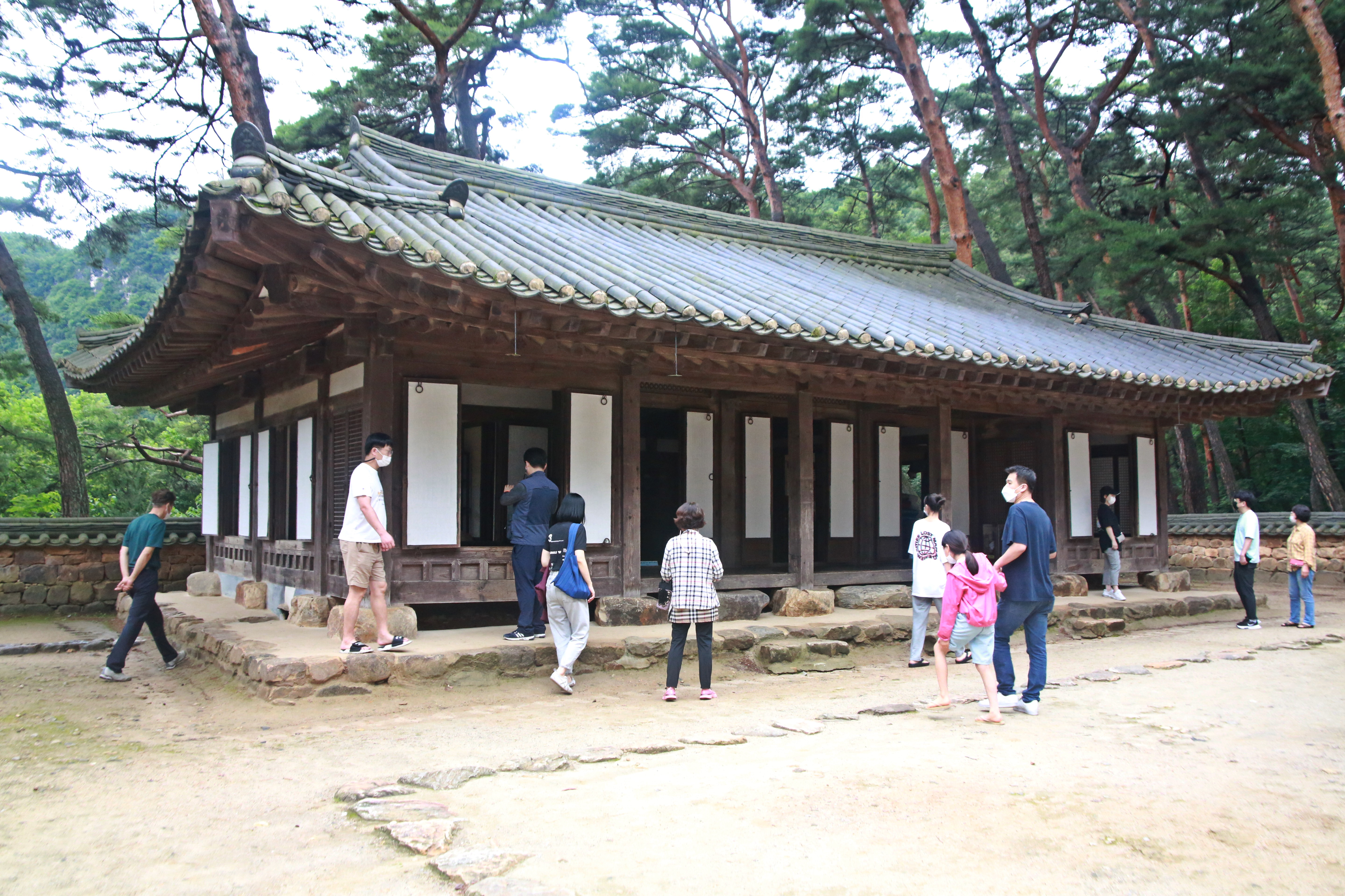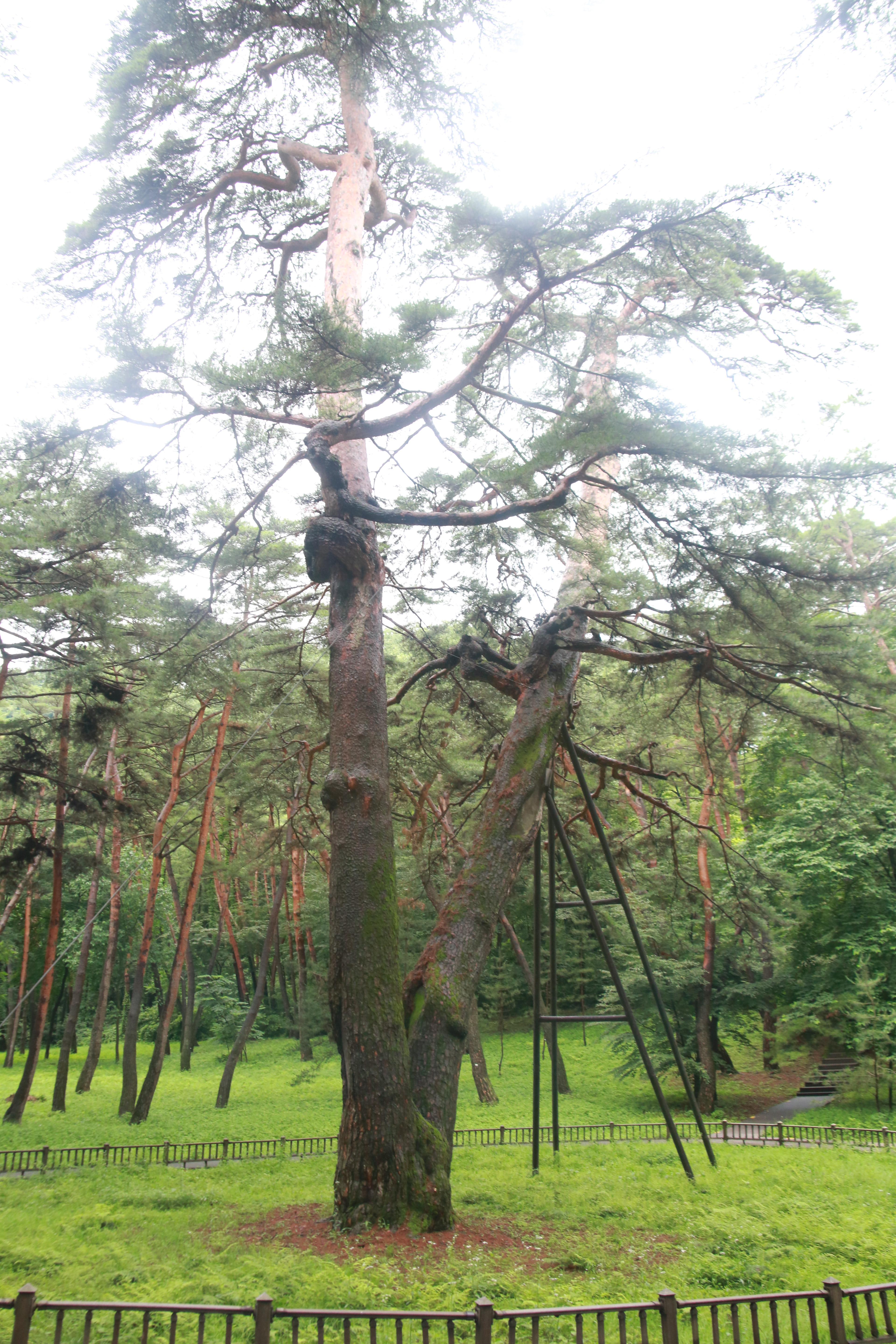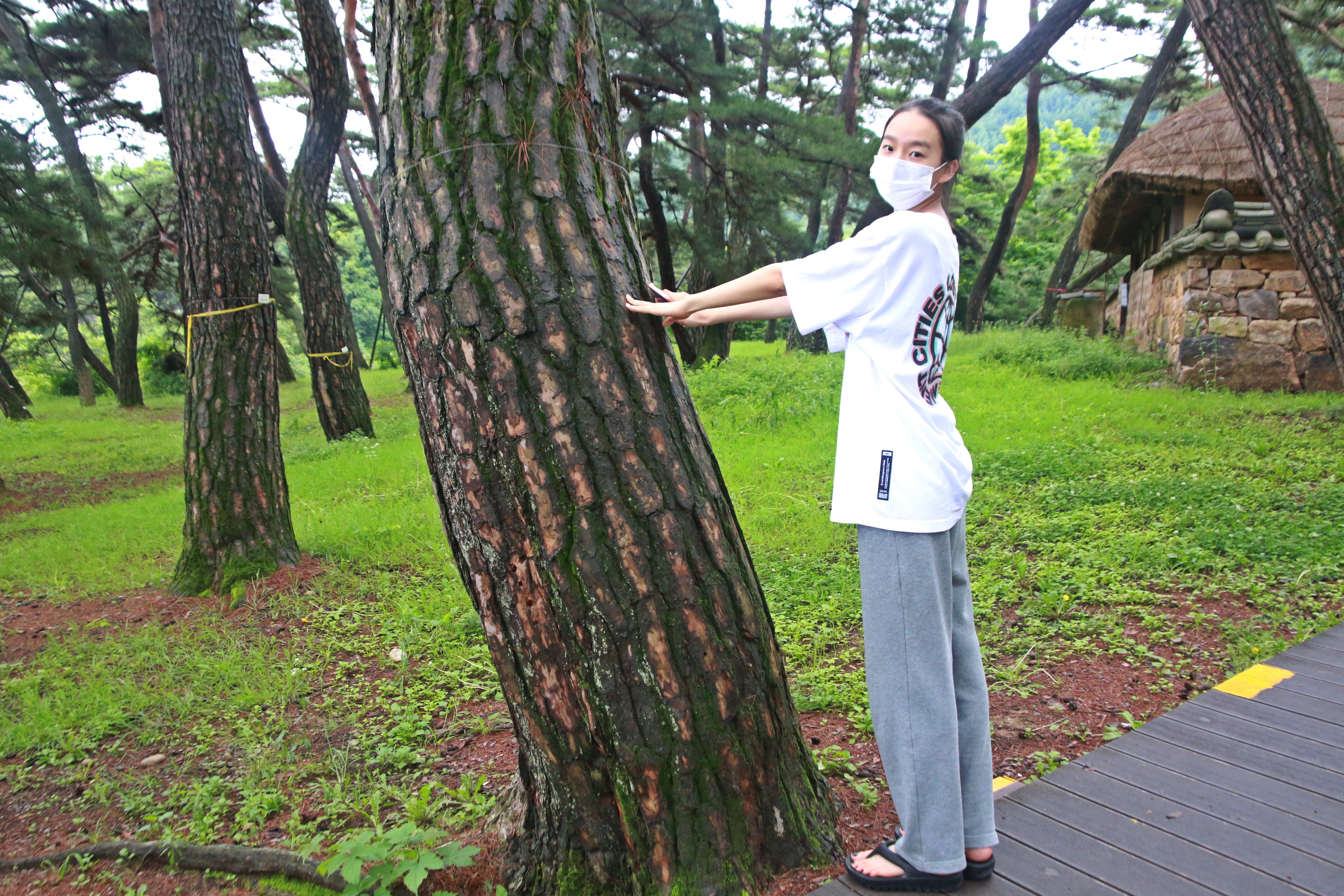 우리 가족은 청령포 주차장에 주차하고 입장표를 사고 선착장으로 갔다. 관광객은 많지 않아 정원 48석이지만 20여명이 탔다. 배는 5분도 채 안되어 강을 건너 강나루에 도착했다. 청령포에는 단종어소, 단묘재본부시유지비, 금표비, 노비가 거주했던 초가집 행랑채, 노산대, 망향탑이 있고, 단종이 유배생활 할 때 두 갈래로 갈라진 이 소나무에 걸터 앉았 쉬었다는 관음송(觀音松)이 있었다. 단종이 유배했을 당시 이 소나무의 나이는 60년으로 추정하고 있다.