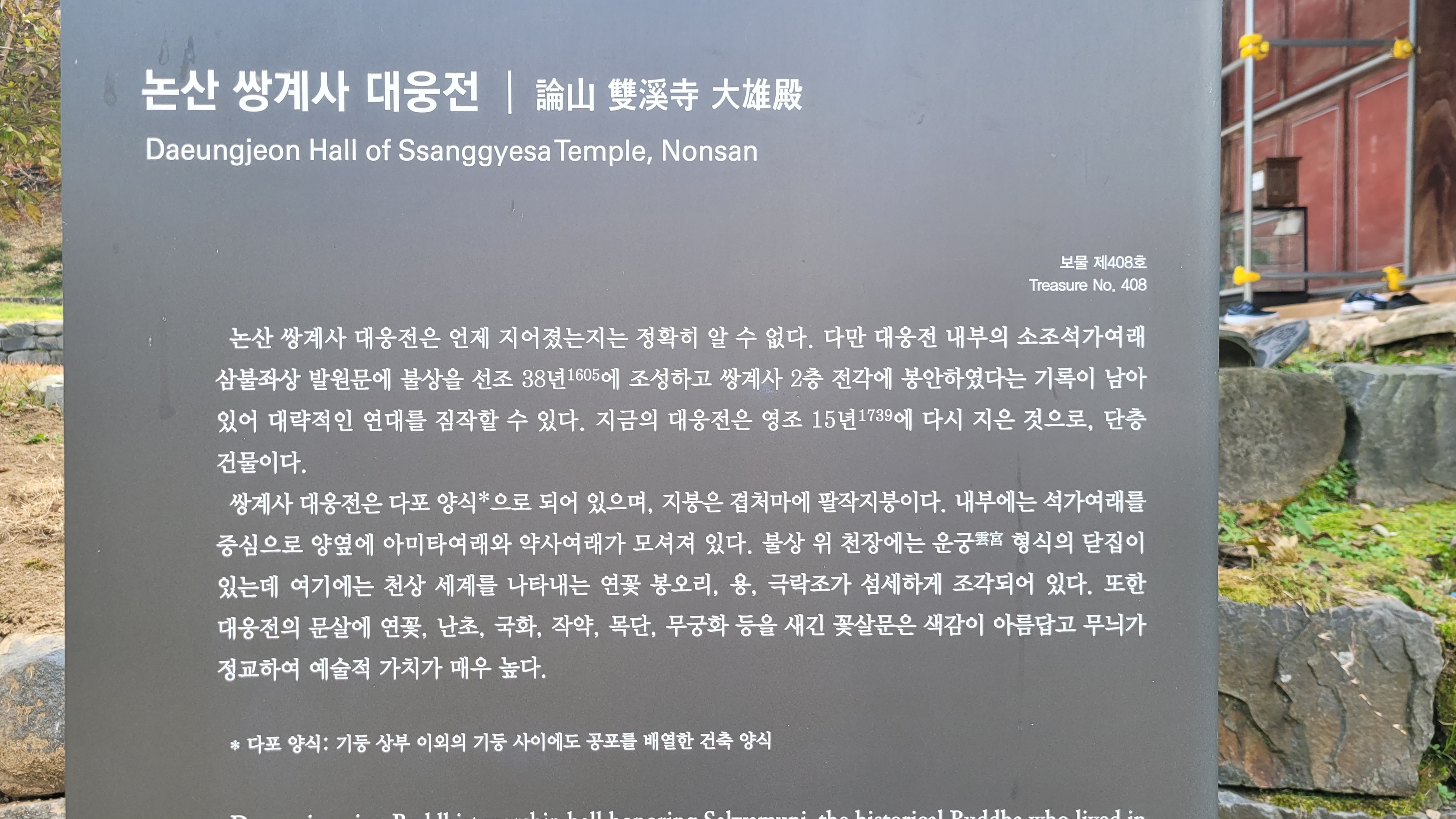 쌍계사는 이름이 좋아서 그런지 충남 논산, 경남 하동, 전남 영암과 진도, 경기 안산, 경북 김천 등 전국 여러 곳에 있다. 나는 지난 10월 29일 단풍이 물드는 맑은 가을 날 판교공 중중 임원과 함께 충남 논산시 양촌면 중산리에 있는 쌍계사를 찾았다. 3년 전쯤에 찾았는데 그 때는 건성으로만 본 것 같다. 이번에 다시 찾으니 여러 가지 볼게 많았다.