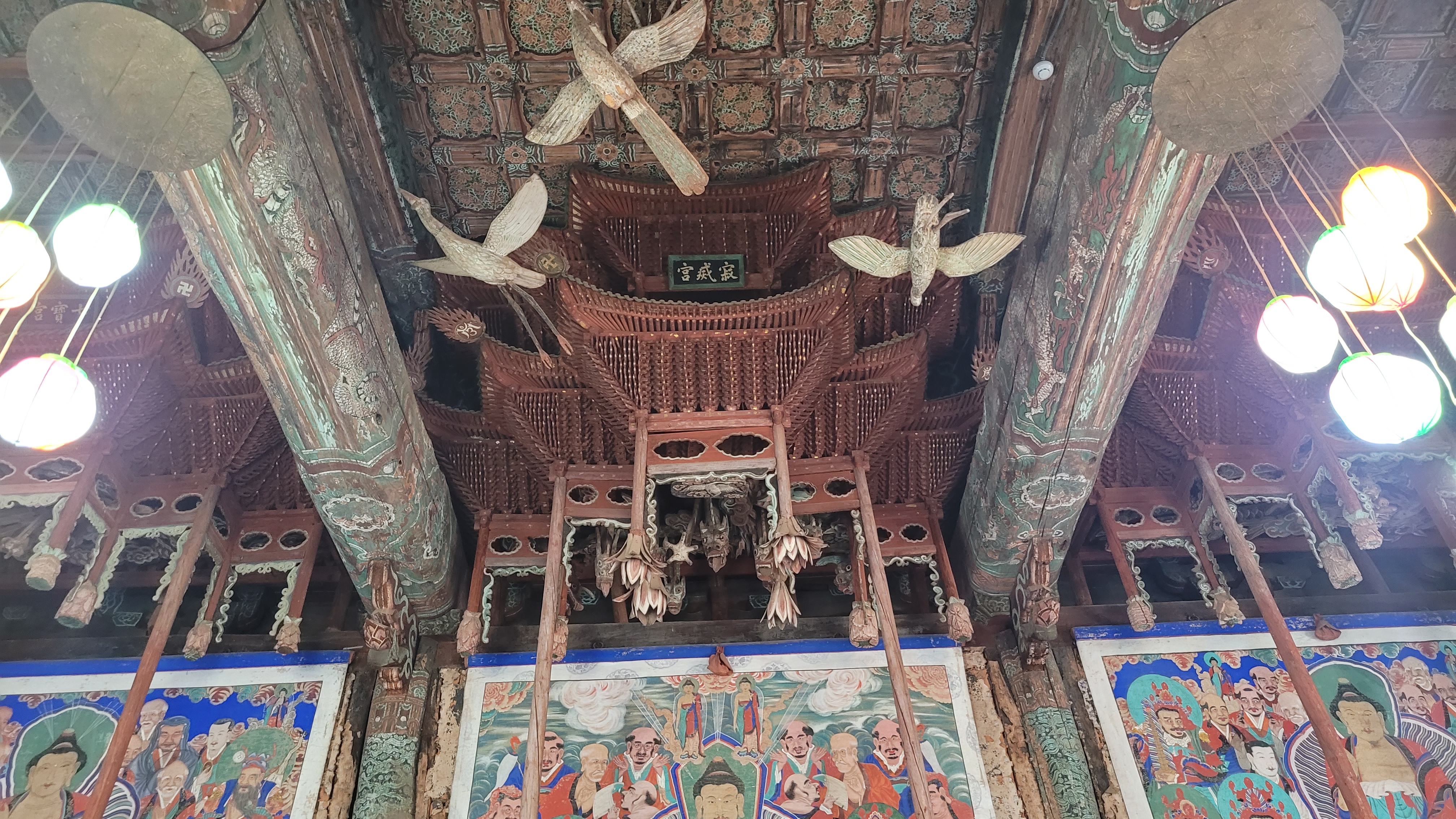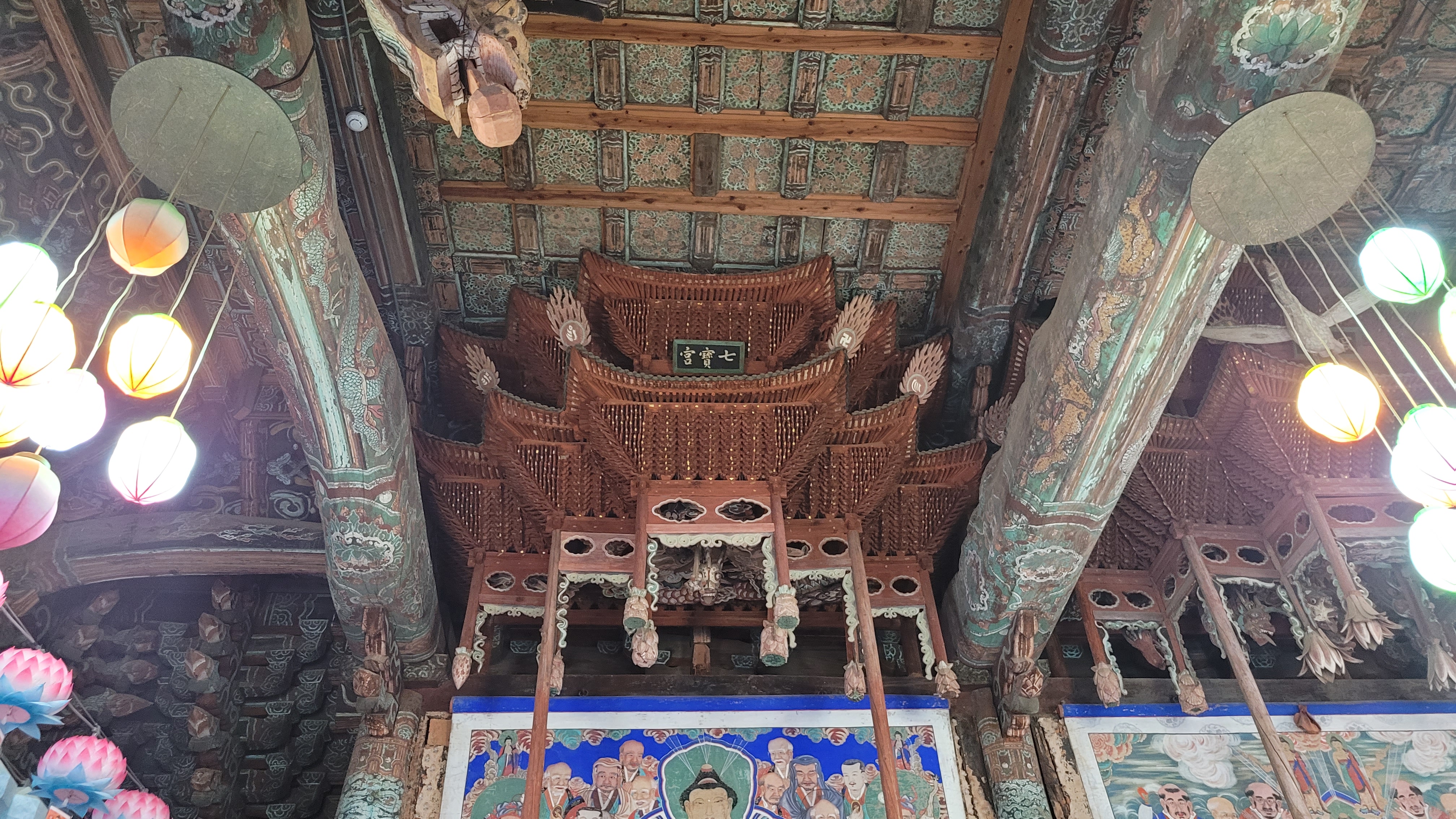우선은 기둥의 굵기가 대단했다. 이렇게 큰 기둥이 있는 사찰이 우리나라에서 또 있을 가 싶을 정도다. 대웅전 안으로 들어가는 보물인 삼존불이 있다. 천정을 살펴보니 봉설, 용두의 여러 조각품으로 장식되어 있다.